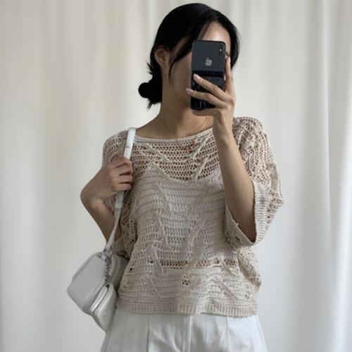 [옷자락]여성 가오리핏 반팔 니트 커버업 여름 스카시 보트넥 펀칭