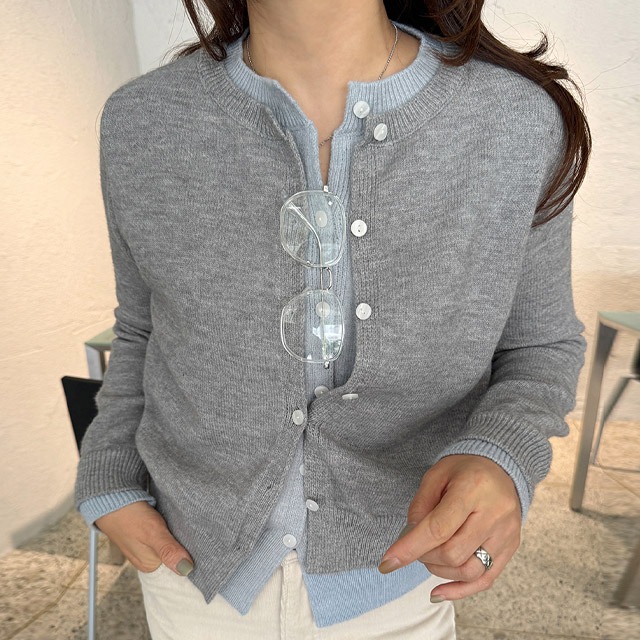 여성 라운드넥 금장 단추 가오리핏 반팔 니트 가디건 DGB-WCD-4738-그레이