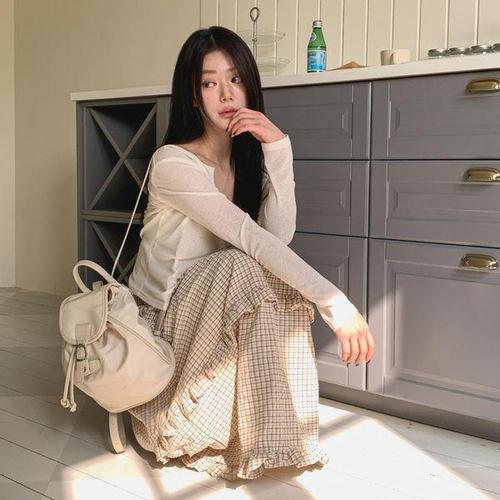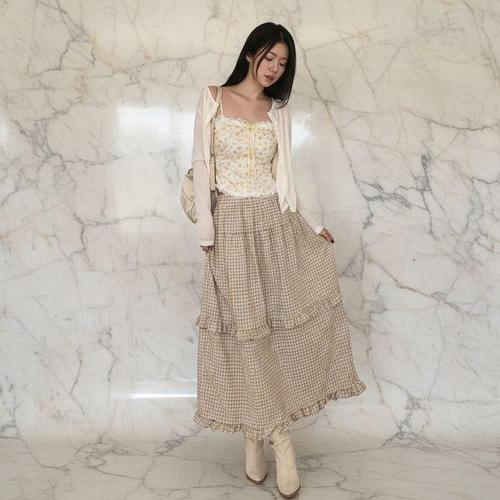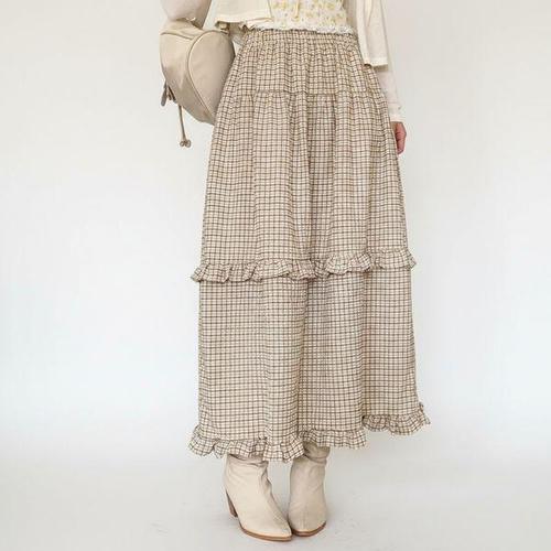 [신상오픈런]여성용 체크 프릴 롱스커트 봄가을 데일리 스타일