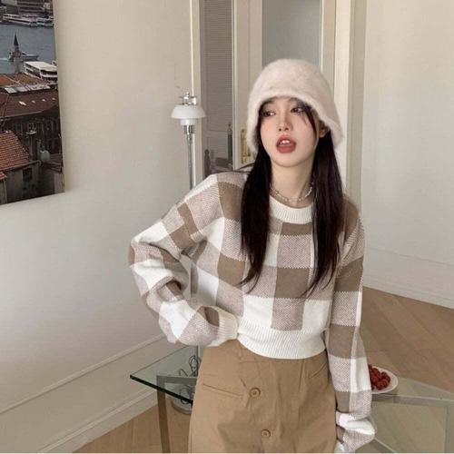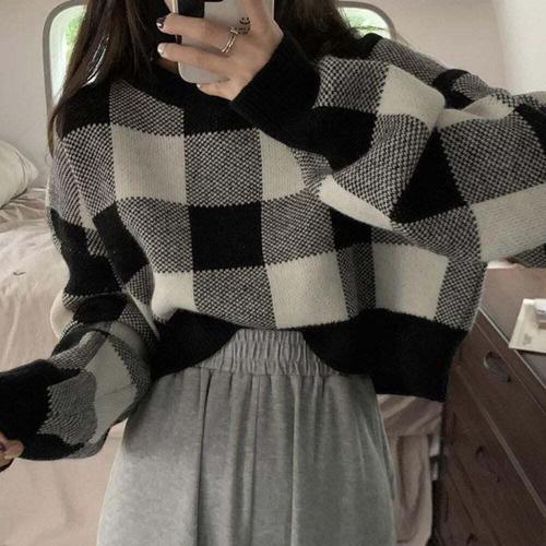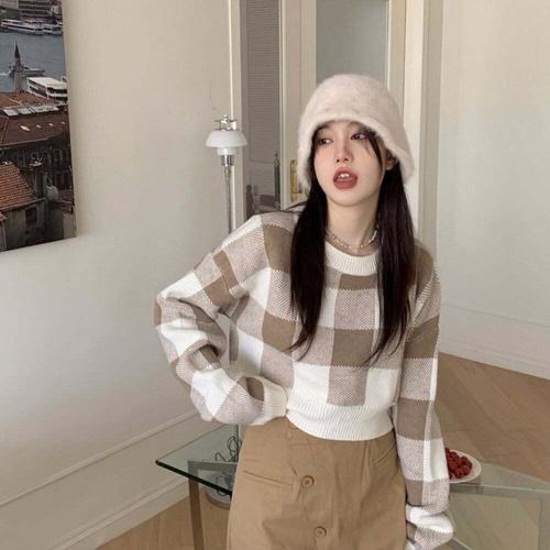 [셀럽하우스]여성 RNOB5958 2컬러 가을 겨울 체크 패턴 크롭 긴팔 티셔츠