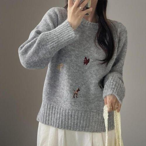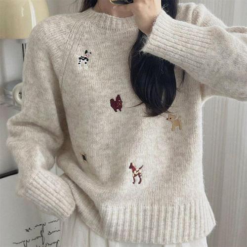 [신상오픈런]여성용 귀여운 강아지 자수 라운드 니트 가을 울 스웨터