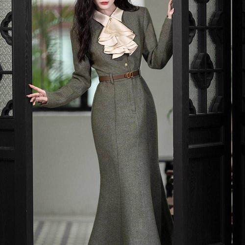 아뗄릭 로브스 우아한 프릴 소매 라운드넥 롱 드레스 02115 빅사이즈 포함