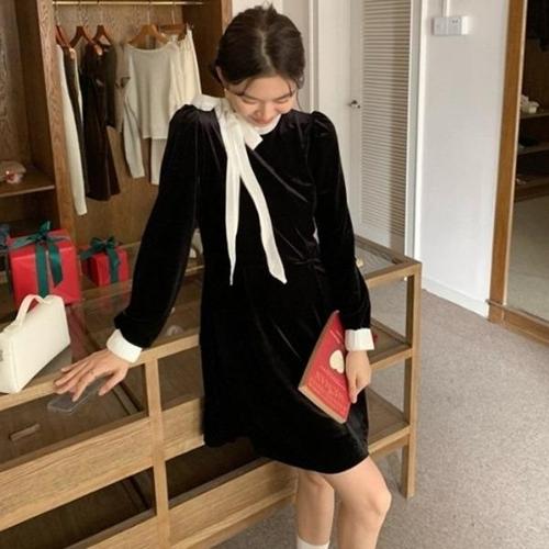 [다잇템_패션]여자 검정 리본 벨루어 쁘띠 콘트라스트 원피스