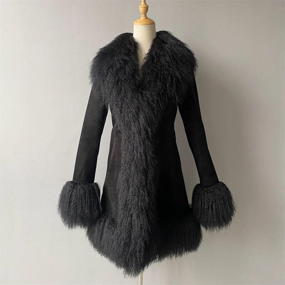 Jaxmonoy 천연 몽골 양털 여성용 리얼 스웨이드 코트 2025 가을 겨울 따뜻한 가죽 재킷 패션 슬림 롱 코트