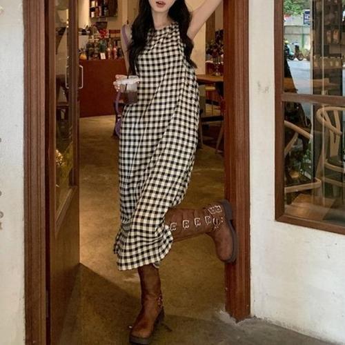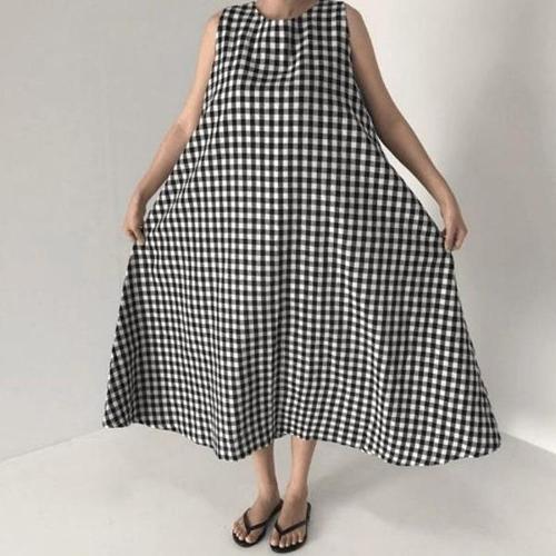 [다잇템]여자 박스핏 격자 고방 슬리브리스 롱원피스