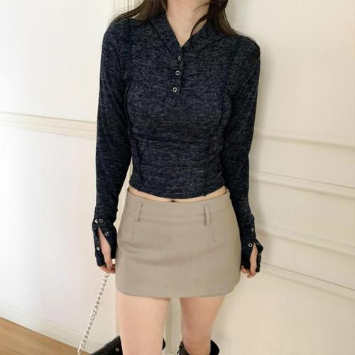 [시크블랙]프레디 또또 버튼 슬림핏 세미 크롭 절개 후드 니트