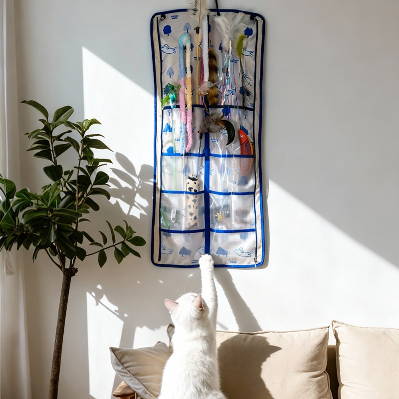 TEMU 고양이 장난감 벽걸이 수납 가방 (고양이 막대 홀더, 털 관리 빗 상자, 치과 스틱 랙 포함)