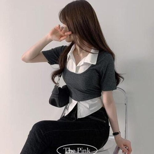 더핑크 / 하즈 슬림핏 셔츠 레이어드 골지 크롭 반팔티