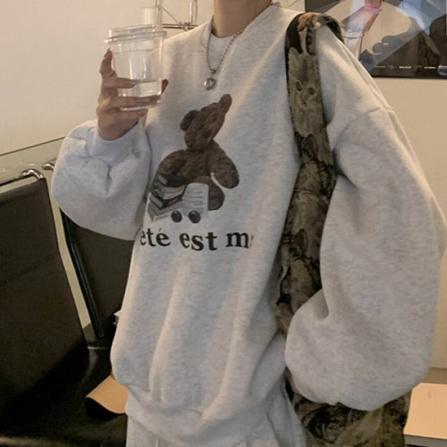 (대박난) 빅사이즈 1+1 여성 귀여운 곰돌이 프린트 풀오버 맨투맨 가을 / 겨울 편한 라운드 날씬해보이는 루즈핏 캐릭터 레터링 기모 간절기 예쁜 젊어 보이는 인스 bf 긴팔티