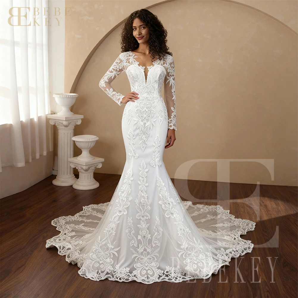 BEBEKEY 여성용 긴 소매 레이스 웨딩 드레스 스쿠프 넥 채플 트레인 머메이드 가운 웨딩 파티 로브