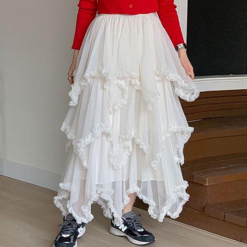[다잇템]여자 귀여운 비침 프릴 티어드 샤 롱스커트