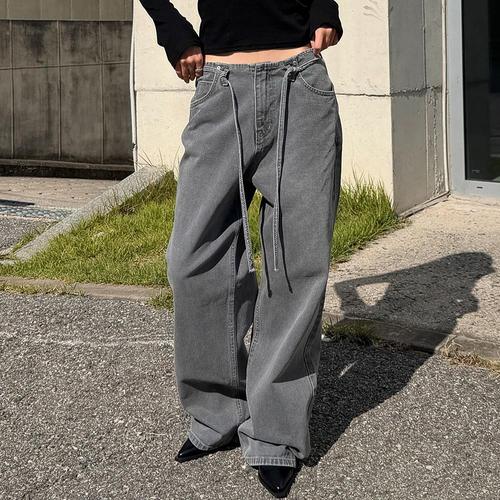 [옷자락] 여자 새깅 로우라이즈 끈 루즈핏 와이드 그레이 청바지