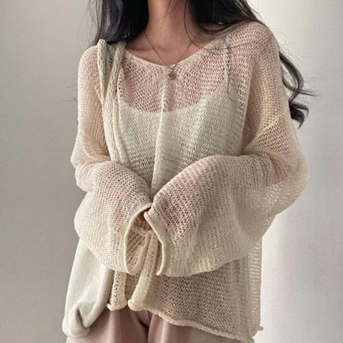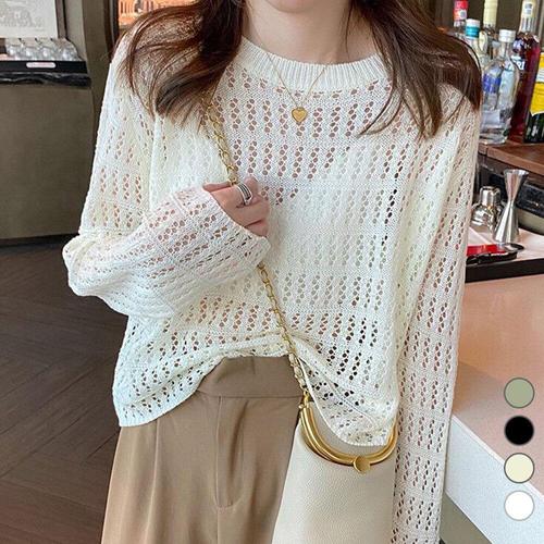 여성 여름 베이직 시스루 루즈핏 크롭 그물 긴팔 니트