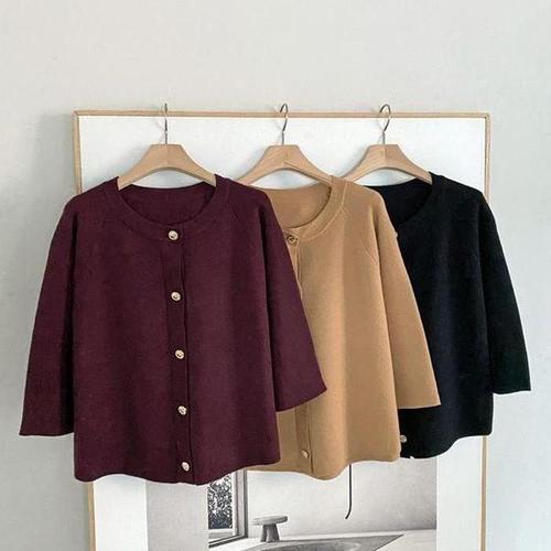 샵앤) 여성 라운드넥 금장 단추 가오리핏 반팔 니트 가디건 DGB-WCD-4738-그레이