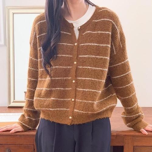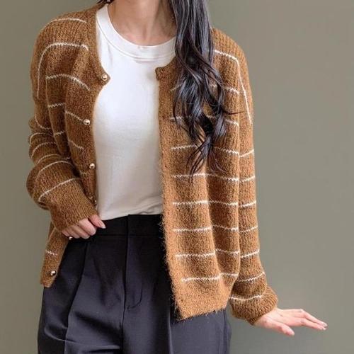 [신상오픈런]|CSJ6784|여성 부클 울 니트 금장 버튼 스트라이프 라운드 가을 카디건_23067481_597559