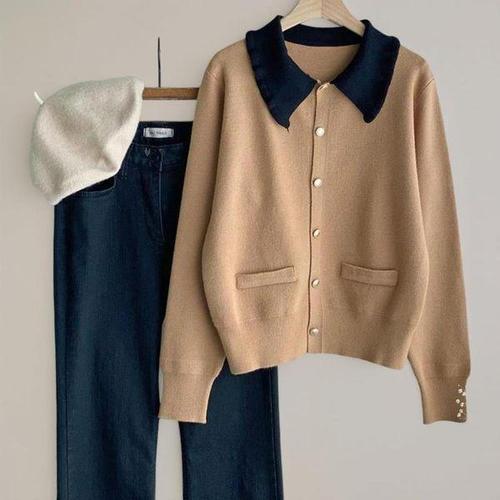 [신상오픈런]여성용 심플 배색 카라넥 금장 버튼 여유핏 롱슬리브 가디건