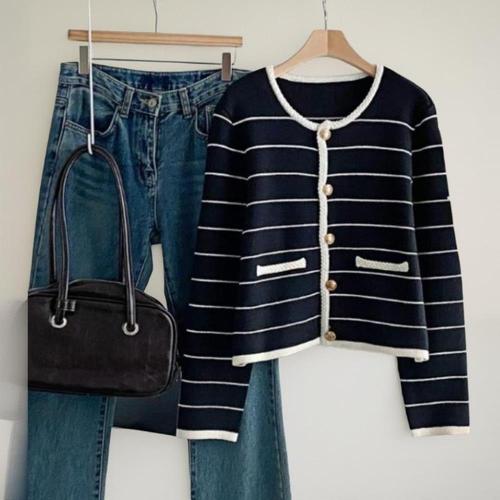 [신상오픈런]여성용 클래식 스트라이프 금장 버튼 배색 니트 가디건