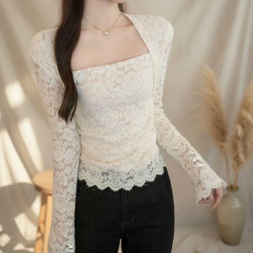 [옷자락]여성 기모 긴팔 레이스 크롭 블라우스 가을겨울용