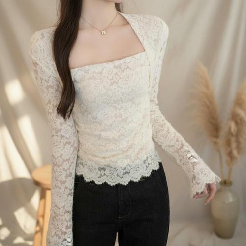 [옷자락] 여성 기모 긴팔 레이스 크롭 블라우스 가을겨울용