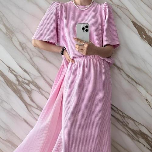 [다잇템][다잇템] 여자 벨벳반팔티 긴치마 골지 박스 H라인 세트_20404600_588872