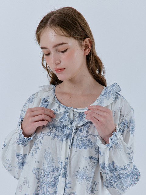 [까사멜로우] 로에 코튼100% 국내제작 부드러운 프릴셔츠 원피스 잠옷 블루
