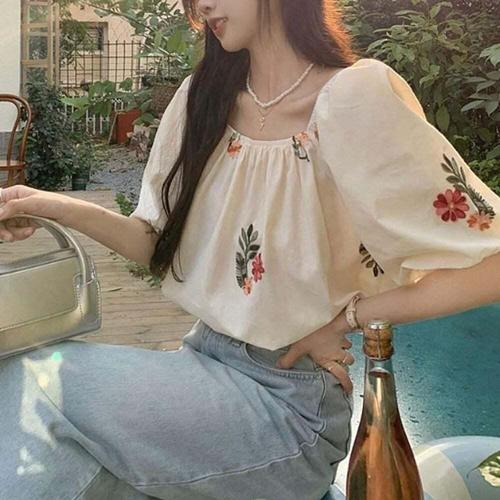 [신상오픈런]여성 꽃무늬 펀칭 레이스 스퀘어넥 퍼프 소매 박스 블라우스 (39096281)