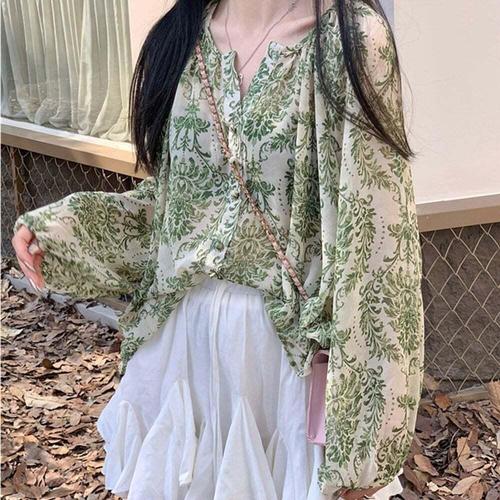[셀럽하우스]그린 RFKQ2458 꽃패턴 루즈핏 블라우스 20대 여대생 상큼한 룩