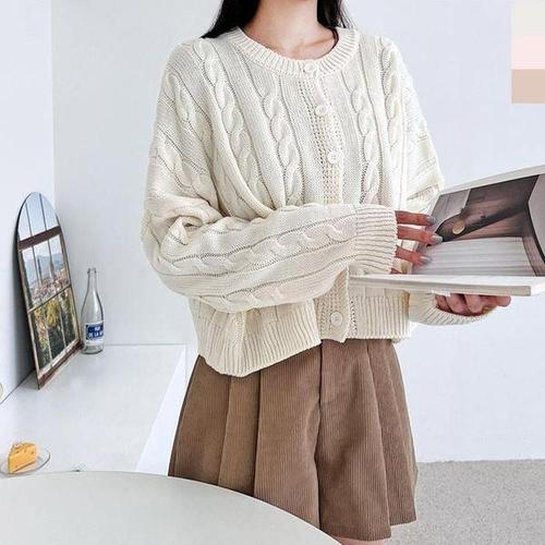 네모엔룩 케이블버튼 여성용 꽈배기 걸즈 베이직 크루넥 니트 가디건