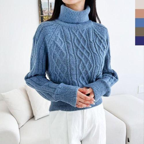 [옷자락] 여성 클래식 꽈배기 오버핏 터틀넥 긴팔 니트