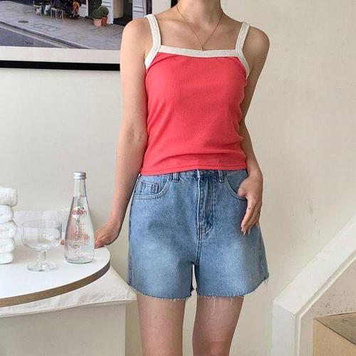 [옷자락] 여성 키치무드 배색 어깨끈 면혼방 나시 티셔츠
