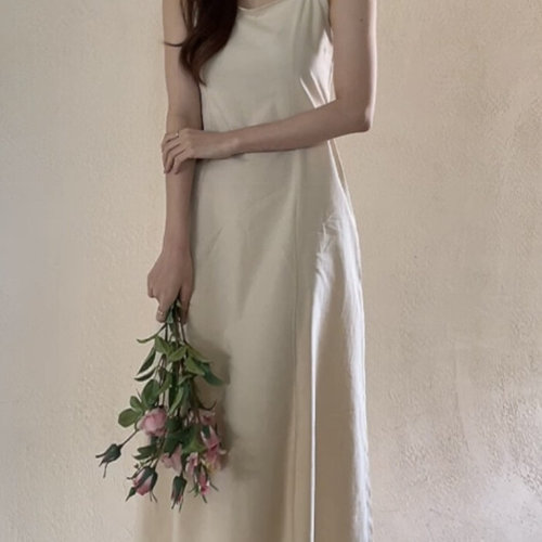 스몰웨딩 하객룩 끈나시 라운드넥 드레일 롱 슬림 원피스