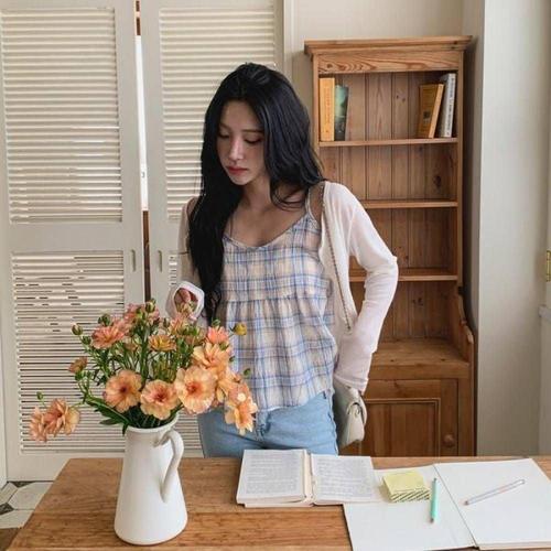 끈나시 쉬폰 여름 휴양지 체크 롱니트 크롭 플 WFKNXMQ