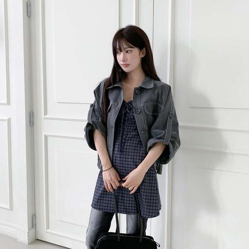 [옷자락]여성용 체크 무늬 코튼 미니 원피스 리본 어깨끈