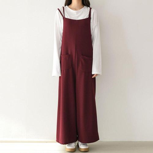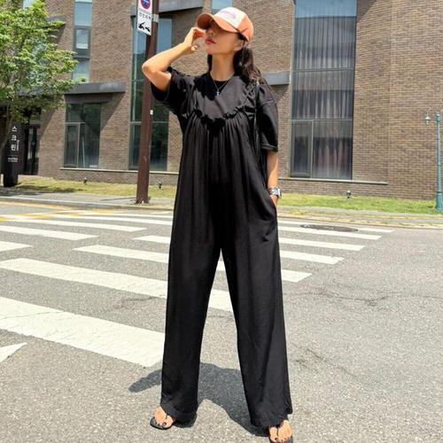 [다잇템_패션]여성 마원단 주머니 끈 와이드핏 칠부 점프수트
