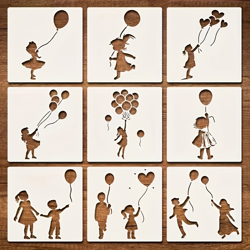 TEMU 9개 재사용 가능한 풍선 소녀 스텐실 - DIY 페인팅, 벽 예술, 가구, 나무 표지판, 캔버스 공예 및 홈 데코 프로젝트를 위한 3, 94인치 하트 모양 디자인, 공예 스텐실 | 재미있는 디자인 | 내구성 있는 플라스틱