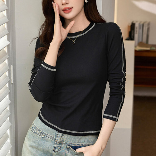 나바바 / NT1427 캐주얼 얇은 단가라 라운드넥 긴팔 티셔츠