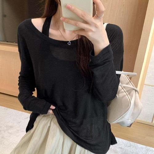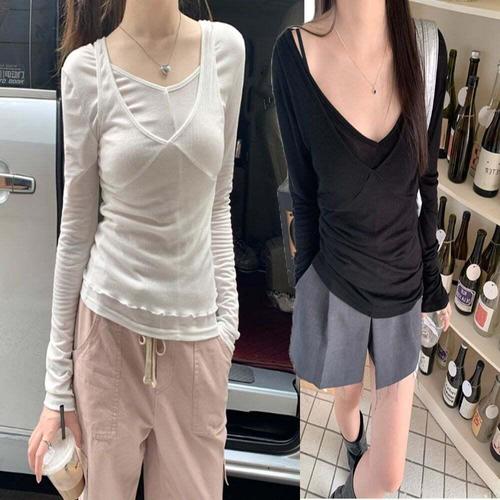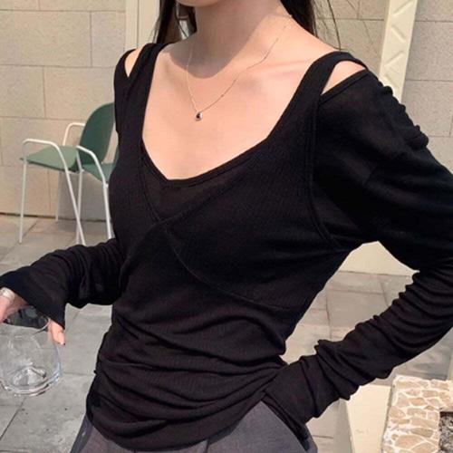 [셀럽하우스]슬리브리스 JADY9431 레이어드 긴팔 데일리 여자 티셔츠 세트