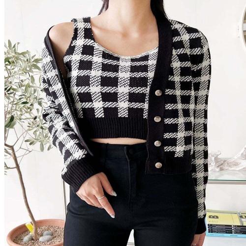 여성 배색 크롭나시티+긴팔가디건 세트