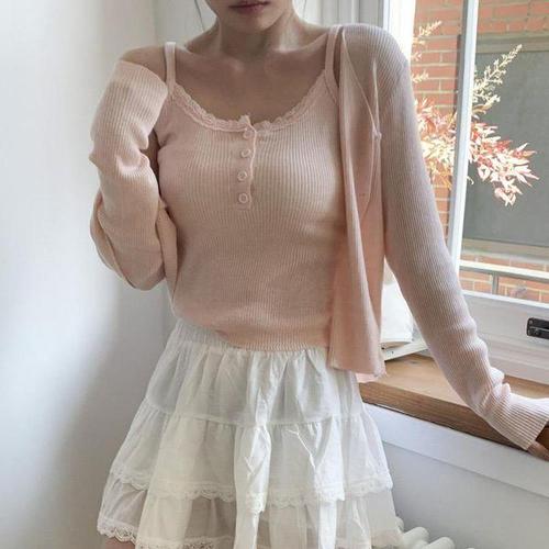 [신상오픈런]여성 레이스 브이넥 버튼 나시와 골지 가디건 세트