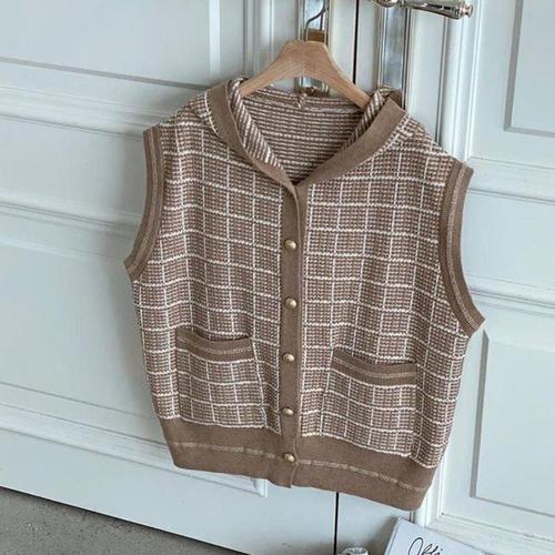 [옷자락]여성 체크 무늬 금장 단추 포켓 후드 민소매 니트웨어