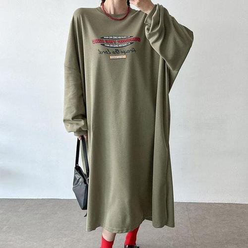 문에이블 데일리 편안한 영문 나염 곰돌이 베이직 롱 맨투맨 원피스