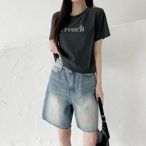 |KHT947D|여성 크롭 반팔티 나염 디자인 레터링 코튼 라운드넥