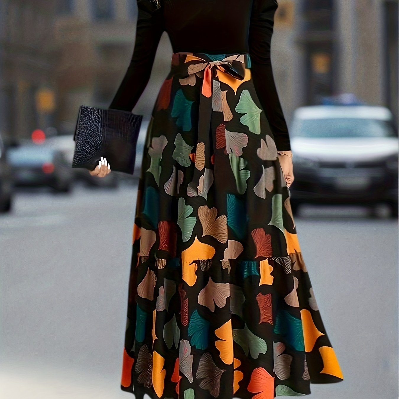 TEMU 봄/가을 신상 빈티지 패치워크 긴팔 드레스 - 은행잎 프린트, 허리끈 및 플레어 맥시 스커트 여성용