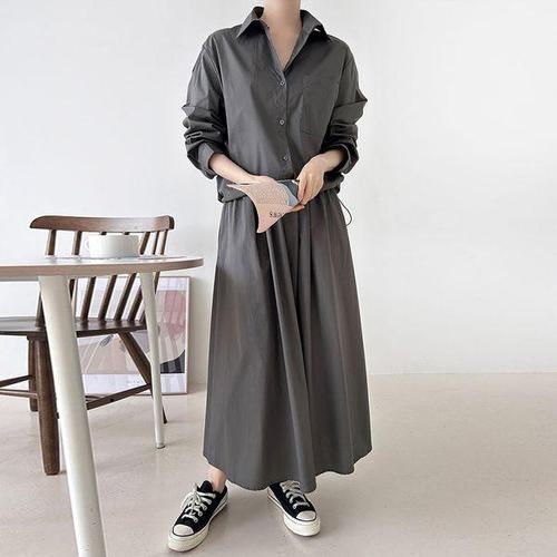 [유야]밑단 스트링 카라 셔츠 밴딩 롱스커트 세트 투피스 셋업 -SST0108H- 빅사이즈 루즈핏 여성 가을