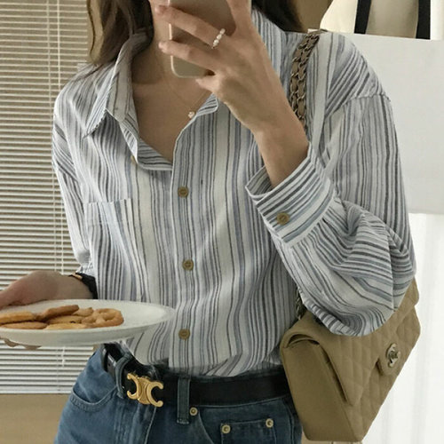 슈팅스타 / 심플 베이직 데일리 스트라이프 린넨 혼방 셔츠