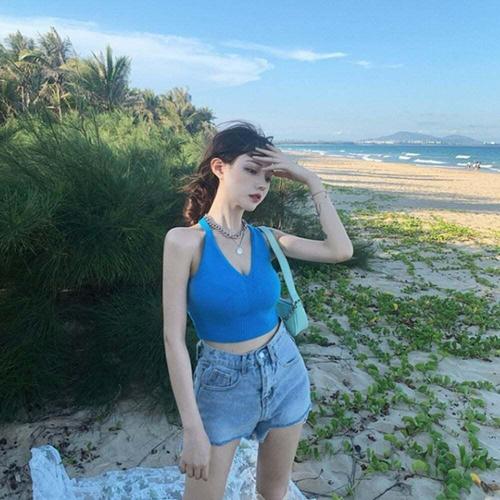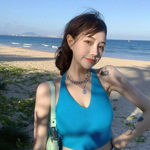 [셀럽하우스]4컬러 RFUD4486 니트 끈 홀터넥 백리스 나시 바캉스룩 크롭티