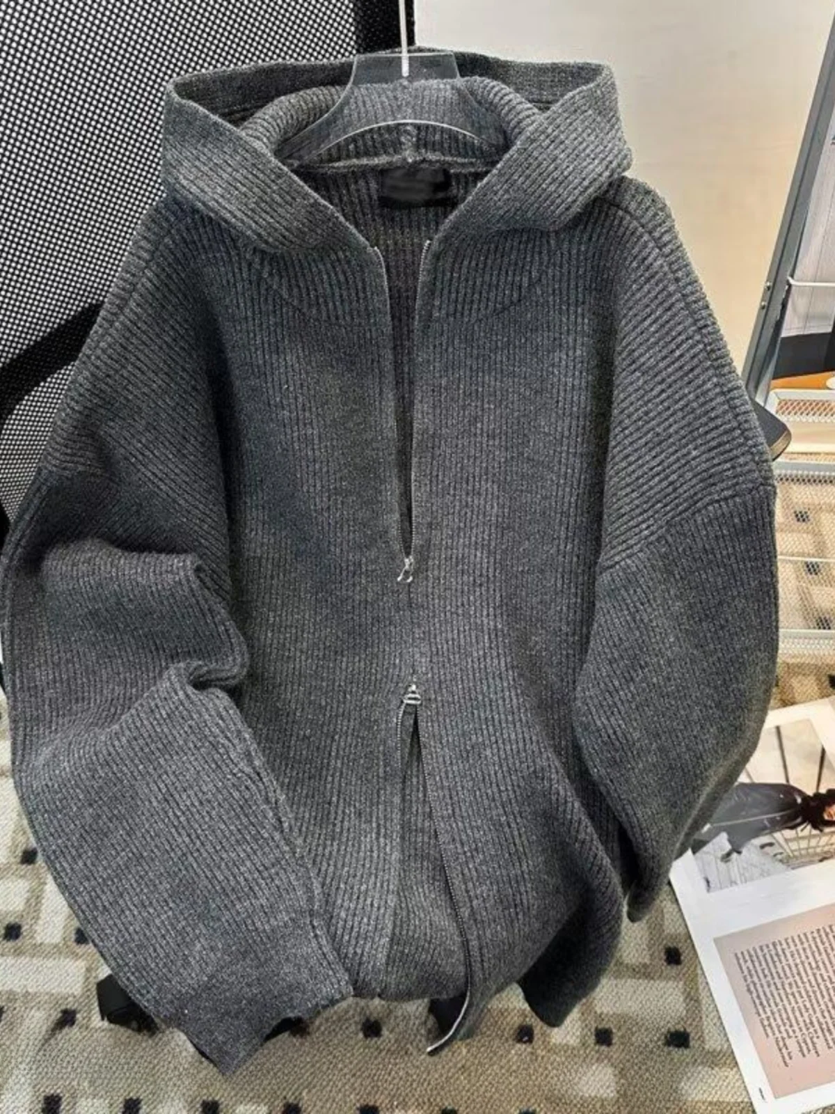 회색 후드 오픈 가디건 스웨터 남성용 가을 겨울 루즈 캐주얼 니트 아우터웨어 더블 지퍼 청년 활력 스타일