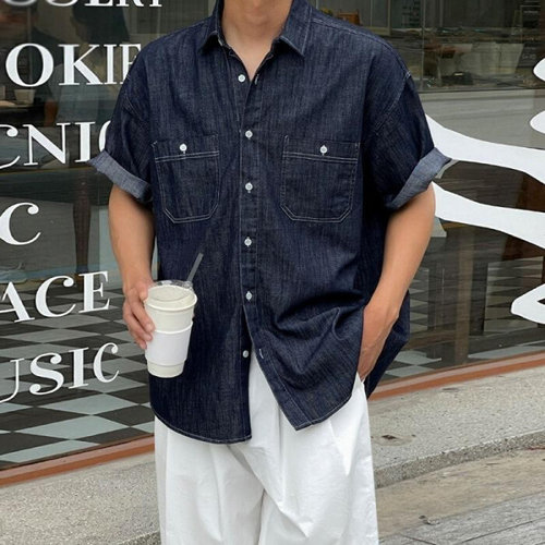 제로투올샵2 / 복고풍 남성 반팔 데님 셔츠 블랙 2XL