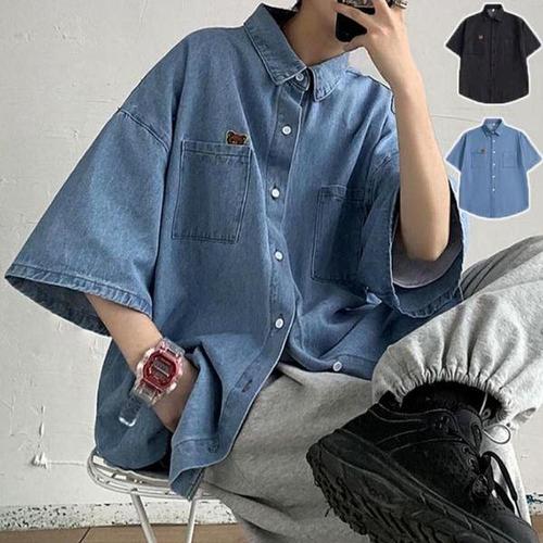 [에이치플러스몰]남성 여름 꾸안꾸 귀여움 캐주얼 포켓 곰돌 데님셔츠