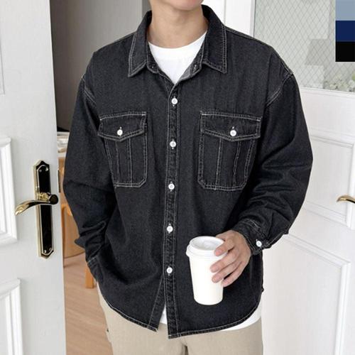 KDNC 남성 워싱 데일리 루즈핏 캐주얼 긴팔 투포켓 데님셔츠